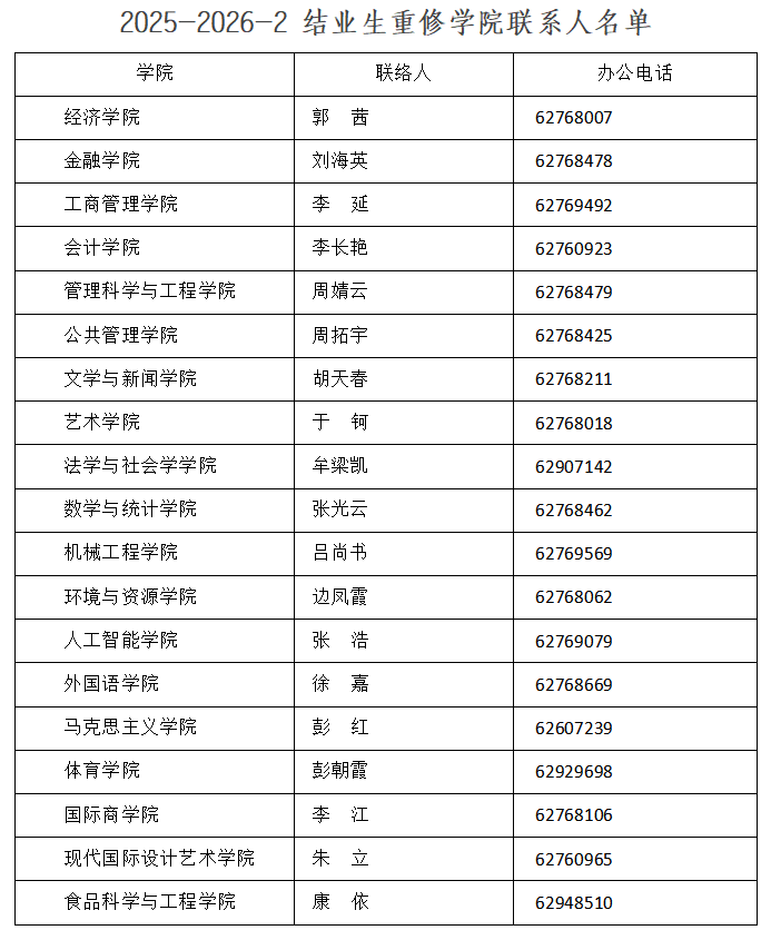 为便于及时接收相关通知和安排,准确填报重修课程,请联系专业所在学院(联系方式见附件),加入对应的企业微信群,咨询相关事宜。