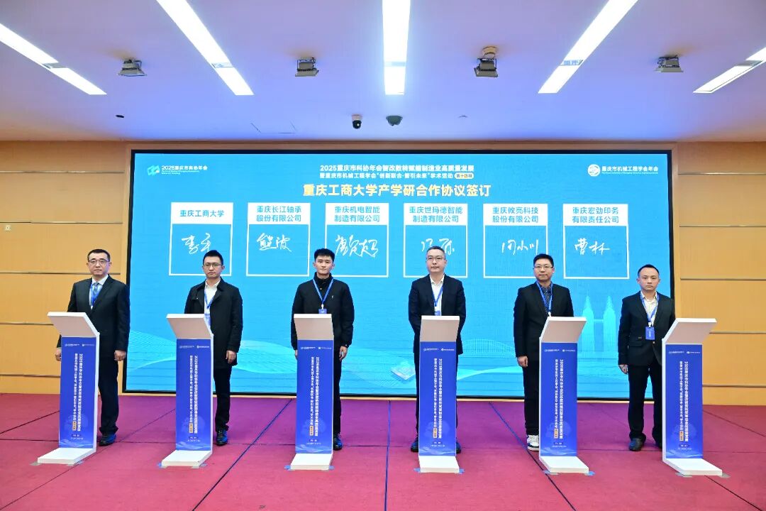 在与会领导和嘉宾的共同见证下,机械工程学院院长李平教授代表学院分别与重庆长江轴承股份有限公司、重庆机电智能制造有限公司、重庆世玛德智能制造有限公司、重庆筱亮科技股份有限公司、重庆宏劲印务有限责任公司五家企业代表,签署了产学研合作意向协议。校企双方将聚焦高端装备、智能制造、绿色制造、智能交通、绿色包装等领域,深入推进产教融合,积极开展人才培养、技术攻关、成果转化等产学研深度合作,共促高质量发展