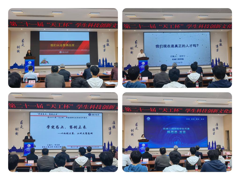 2022年10月28日下午,机械工程学院第二十一届“天工杯”学生科技创新文化月启动仪式在南岸校区明德楼1019报告厅“线下+线上直播”方式隆重举行。重庆工商大学党委副书记、校长孙芳城教授,党委常委、副校长李国军教授,党委学工部申卫东部长,教务处胡卫军副处长,校团委胡婧婷副书记莅临现场指导;机械工程学院全体师生员工和学生家长2000余人参加了活动。活动由学院党委副书记陈春洁主持。