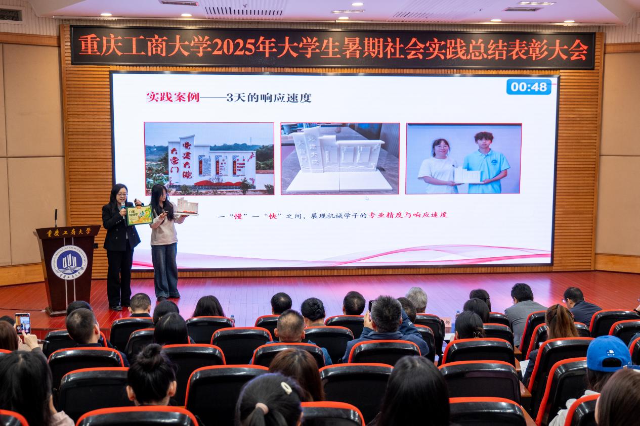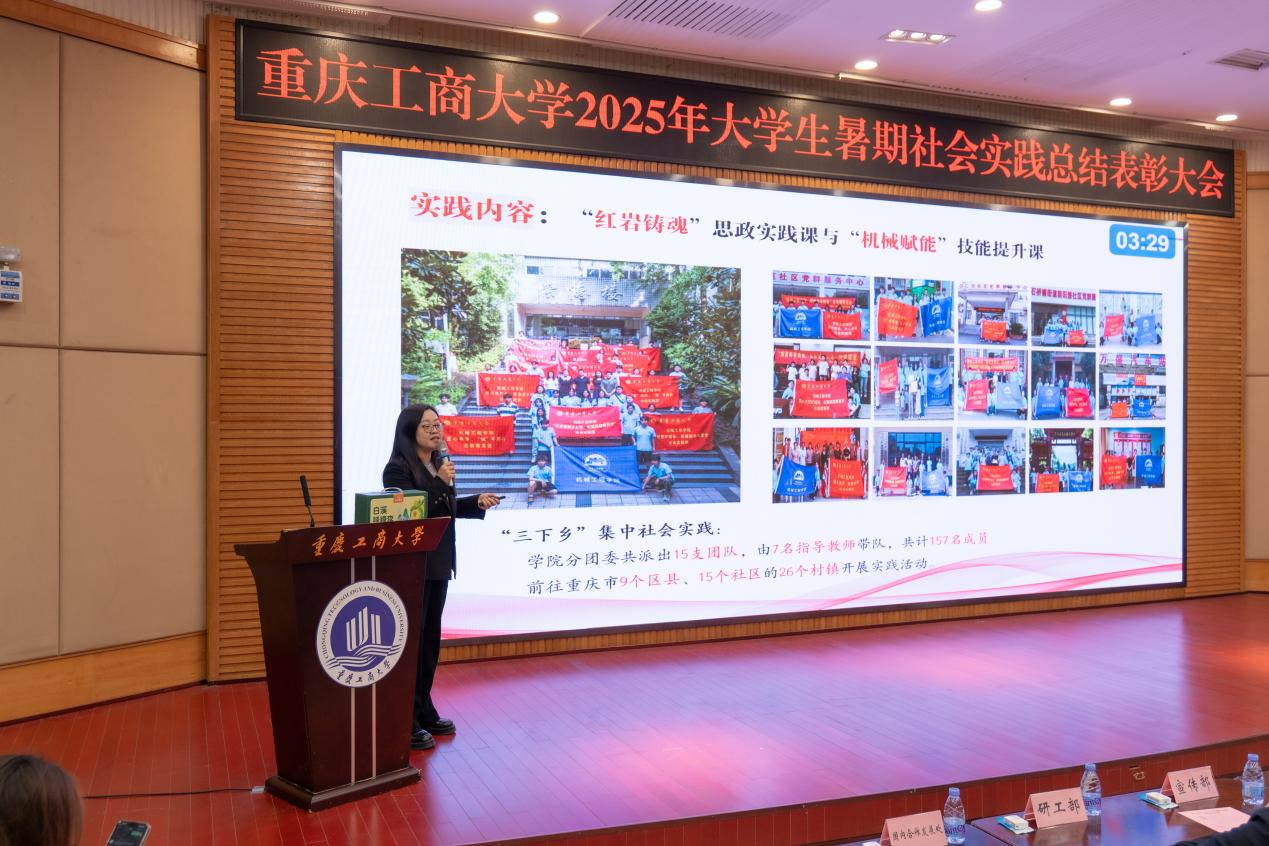 刘静老师在总结汇报中介绍了学院“双课融合”社会实践模式,将“红岩铸魂”思政课程与“机械赋能”专业课程深度融合,实现价值塑造与能力拓展并进。她以两个典型案例彰显实践成效:一是组织跨学院学生为江津支坪镇设计并落地5000余个蜂糖李包装箱,体现协同创新能力;二是实践团在三天内完成测绘、建模与3D打印,高效制作宣传文创产品,展现机械学子的专业响应力与社会责任感。