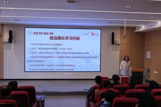 会上,杨娟带领全体教职工集中研学系列重要内容。学习材料包括《习近平对全面依法治国工作作出重要指示》《习近平:推进党的自我革命要做到“五个进一步到位”》等多篇重要讲话与文件精神,内容既涵盖党的建设、法治建设等核心要求,亦涉及网络生态治理、自由贸易港建设等重点领域部署。杨娟书记强调,全体教职工要以学铸魂、以学促干,深入研读学习材料,将理论领悟与教学科研、人才培养等实际工作紧密结合,切实把学习成果转化为推动学院高质量发展的具体行动。