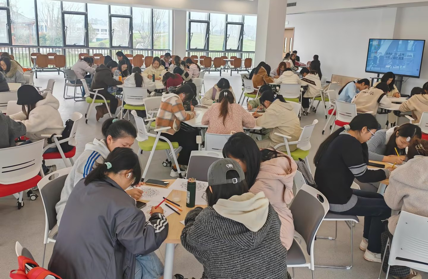 活动伊始,顾咸霜老师致欢迎辞,向全体女同学送上节日祝福随后,陈雪老师以“落笔生花——与内心色彩对话”为主题展开讲解。她从曼陀罗的梵语本意“圆满”入手,介绍了其在荣格心理治疗中的运用,阐释了圆形图案所具有的和谐特质与自我映照功能。通过“调整身心—觉察感受—随心创作—记录感悟—自我疗愈”五个步骤的讲解,她以“涂色时不用思考,治愈会自己发生”的温柔话语,引导同学们放下杂念,专注当下。