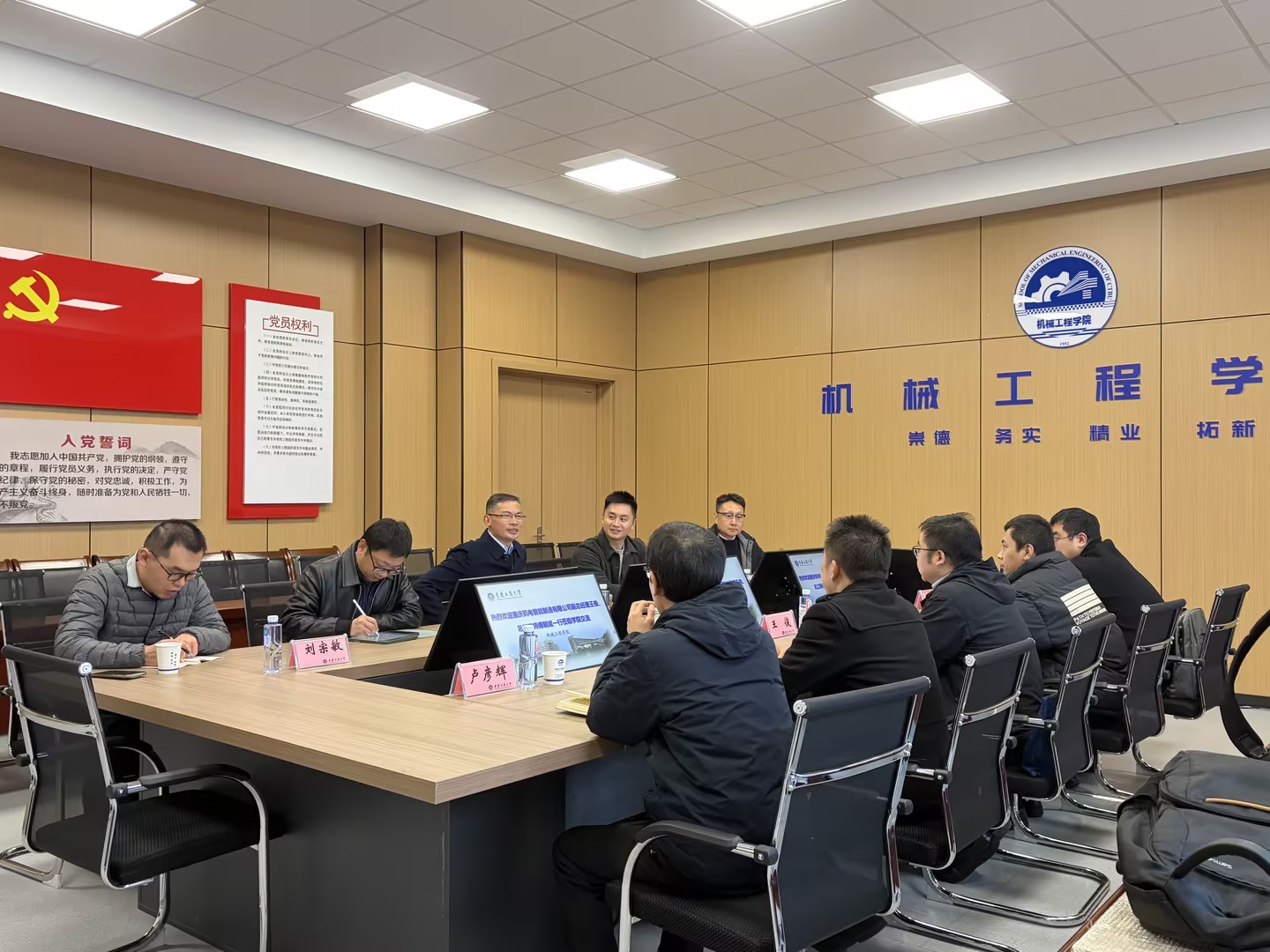 随后,双方在机械工程学院会议室举行座谈交流。机械工程学院副院长杨帅介绍了学院在学科建设、人才培养、科学研究及社会服务等方面的整体情况,重点展示了学院在智能制造、机器人技术、绿色制造等方向的研究特色与成果转化案例。机械工程学院副院长谢俊详细介绍了学院在本科生培养方面的创新举措,特别是与行业龙头企业合作开展的订单式人才培养模式、校企共建课程体系以及学生实践能力培养的具体成效。王俊副总经理介绍了重庆机电智能制造有限公司的发展历程、核心业务板块、技术优势及未来战略布局,表达了在高端装备研发、技术攻关、人才培养等方面与高校开展深度合作的强烈意愿,并对学院订单式人才培养模式表示高度认可,希望未来能进一步拓展校企合作形式,共同培养适应产业发展需求的高素质工程人才。