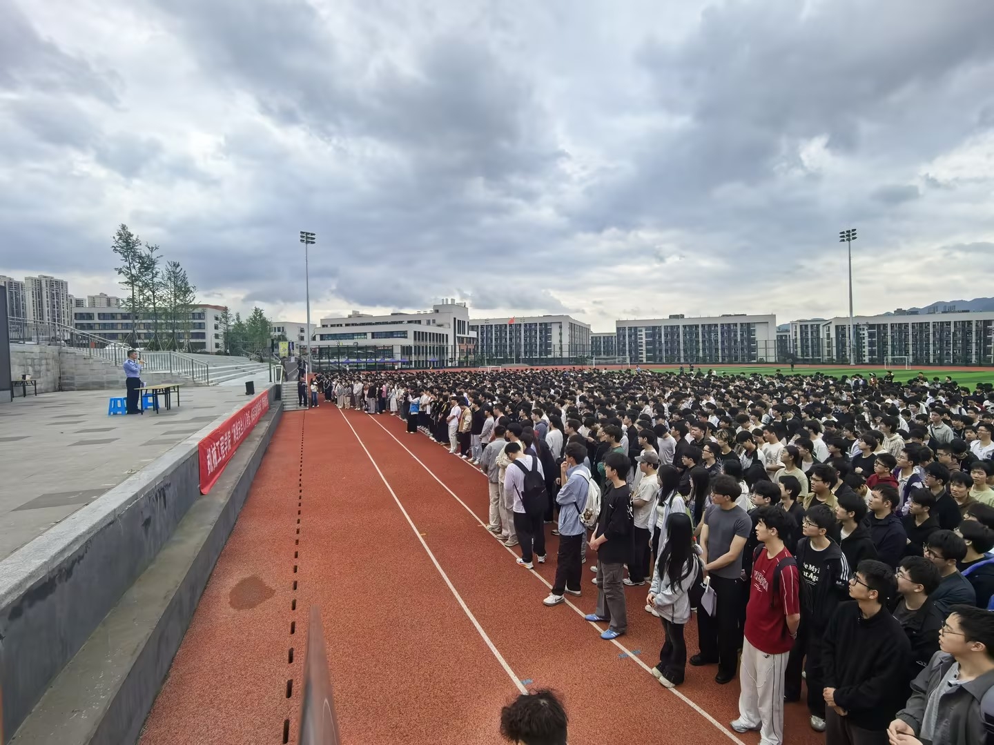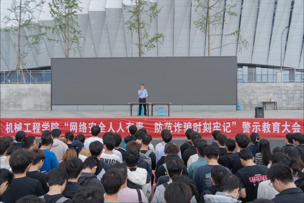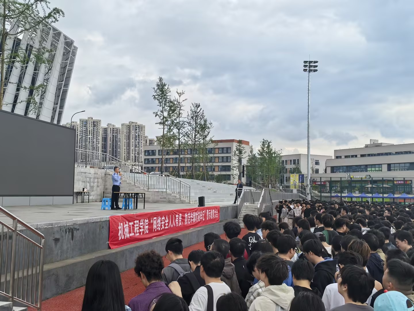 为应对当前日益复杂的电信网络诈骗新形势,筑牢校园安全防线,切实提升学生的风险防范意识与自我保护能力,2026年4月22日,重庆工商大学机械工程学院在茶园校区足球场举办了 “网络安全人人有责,防范诈骗时刻牢记”警示教育大会。学院党委副书记、纪委书记陈春洁主持了本次活动,重庆公安局南岸区分局峡口派出所付强所长为学院全体本科生、研究生辅导员近2900人开展了专题反诈防骗警示教育。