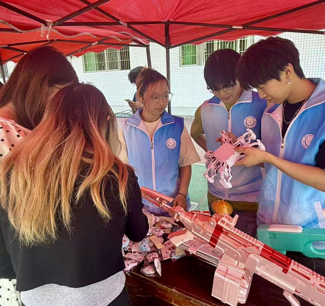 协会成员现场集中展示了科创作品与工科创意周边,将专业知识与奇思妙想巧妙融合,让一件件构思精巧、制作精良的作品鲜活呈现。其中,最吸睛的莫过于由成员自主建模、打印、组装的 3D 打印成品——定制枪械模型和六足机器人模型。从建模设计到打印组装的全流程,均由协会成员独立完成,细节精致、结构巧妙,一亮相便迅速吸引大批师生驻足围观、拍照打卡。成员们一边讲解 3D 打印的技术原理与设计思路,一边演示模型的拼接与机械结构,让大家在互动中近距离感受工科创意与科技制作的乐趣。摊位上还陈列着各类小巧精致的 3D 打印周边,直观展现了 “把创意变成实物” 的科创魅力,让师生们沉浸式体验到科技的趣味与温度。